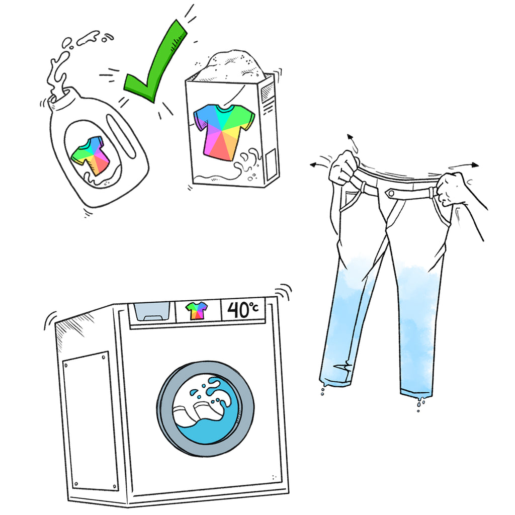 Use laundry detergent as sparingly as possible to prevent harmful residues from forming in the fabric. Colour detergent helps to prevent the fabric from fading quickly. Fabric softeners and similar products should be avoided.
