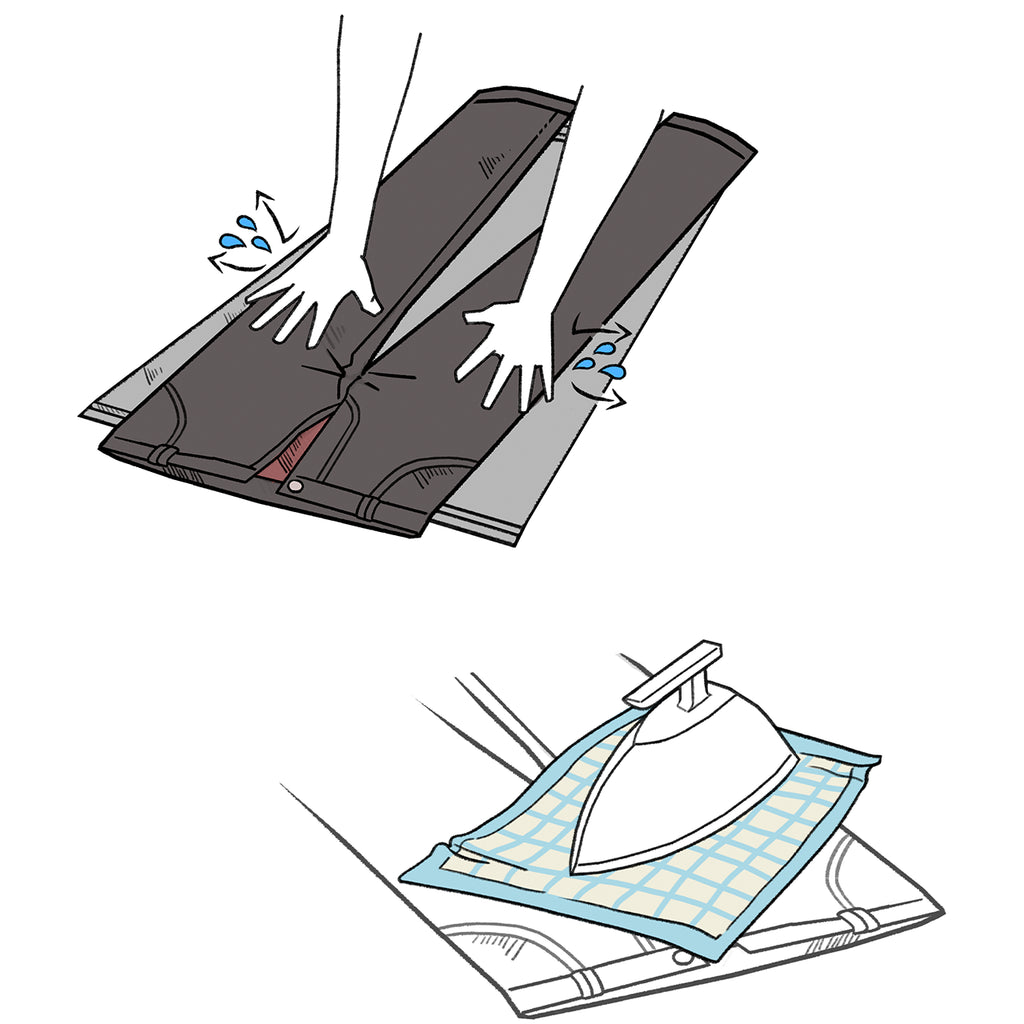 Avoid ironing with steam as this could permanently deform the trousers or result in unwanted creases.