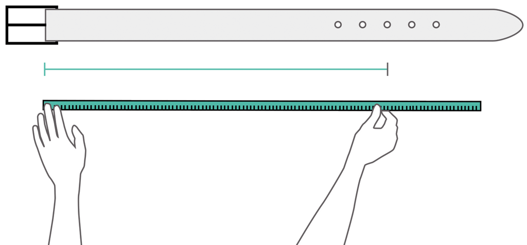Lay the belt down flat, as shown. Measure from the start of the leather at the buckle to the third hole. This gives you your belt size.